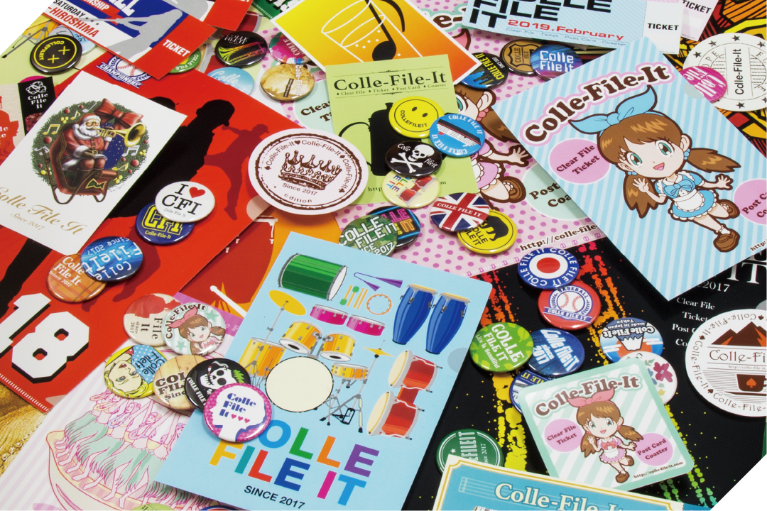 「A4クリアファイル」「A5クリアファイル」「チケット」「ポストカード」「缶バッジ」など を自分の好きな種類・順番でファイルにまとめることが出来ます。