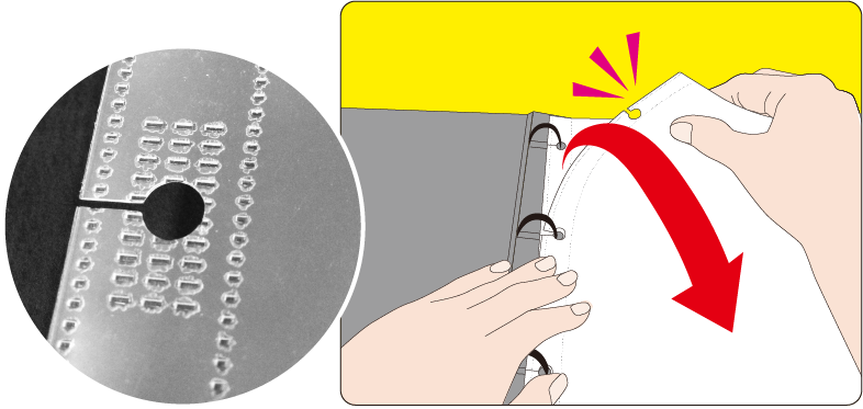 切れ込み部分を抜き差しするだけ。従来のリングファイルのような綴じ具を開閉する手間がありません。